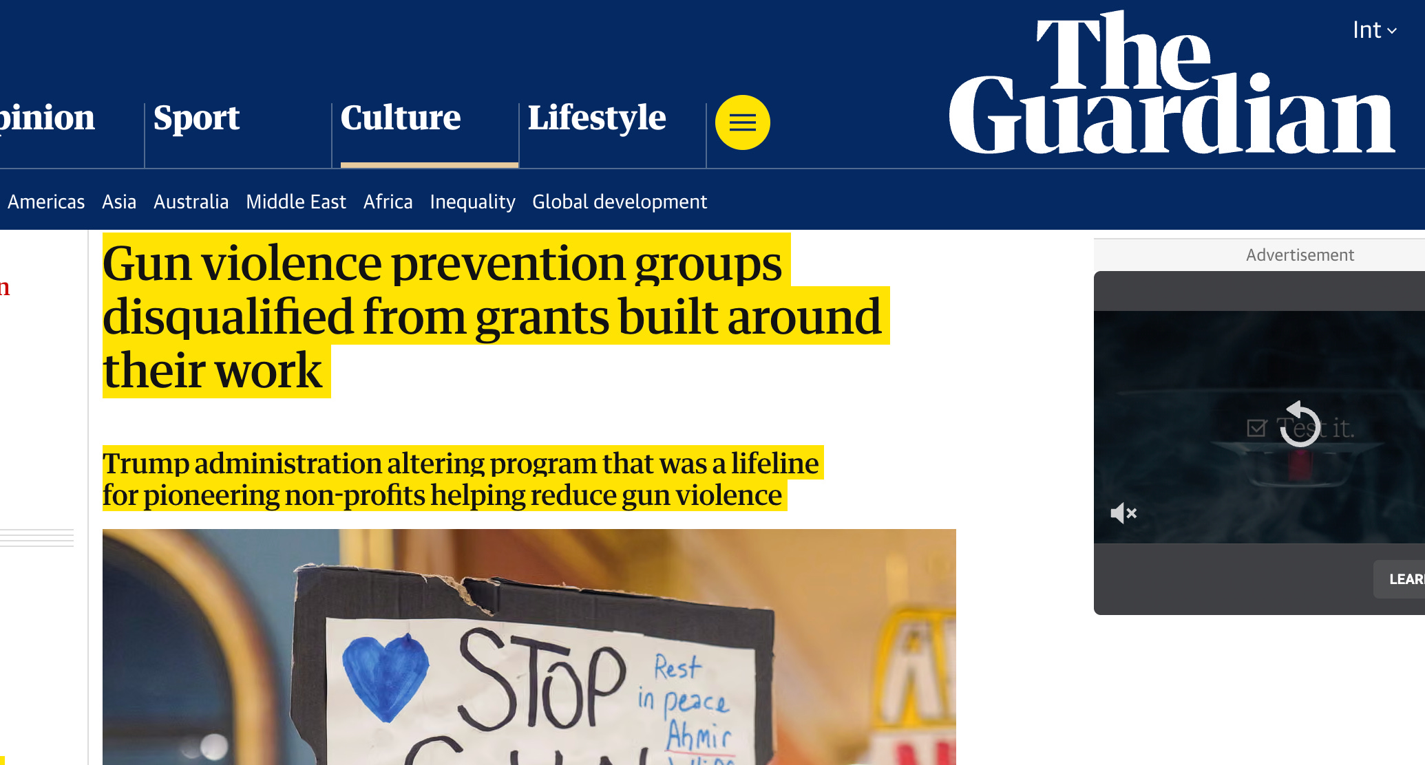 References: https://www.theguardian.com/us-news/2025/oct/26/gun-violence-prevention-non-profit-grants-disqualified?utm_term=68fe2970315a5cb523e1bb3ec00f8319&utm_campaign=GuardianTodayUS&utm_source=esp&utm_medium=Email&CMP=GTUS_email